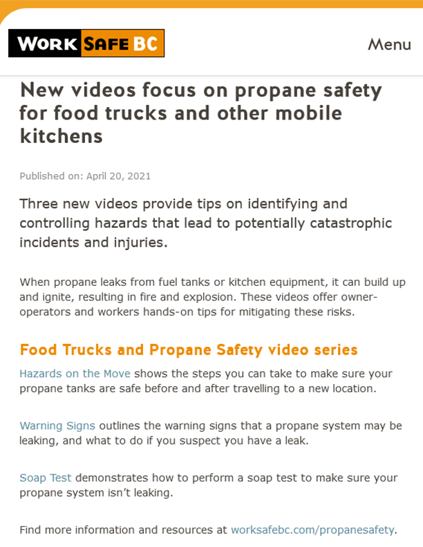 Three new videos focus on propane safety for food trucks and provide tips on identifying and controlling hazards that lead to potentially catastrophic incidents and injuries.