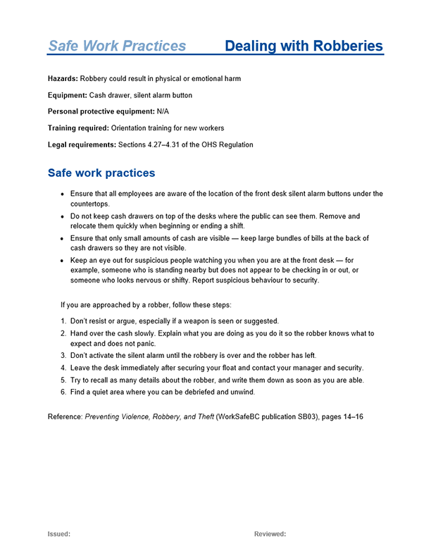 If you are re-orienting the worker, you probably won’t need to do the complete orientation – just focus on the topics that relate to the new situation or new hazards. It’s a good idea to prepare a handout sheet for workers with contact information for supervisors and first aid attendants, as well as where to find more information about worker rights and responsibilities in the Regulation.
