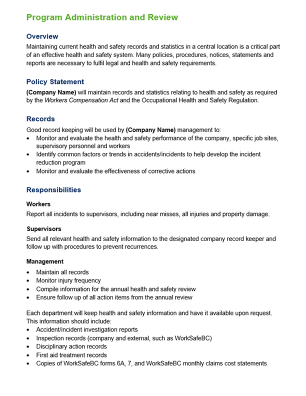 You must maintain at the workplace a record of all injuries and exposures to contaminants covered by the Regulation that are reported or treated. These records must be secured in a confidential fashion and maintained for at least three years.