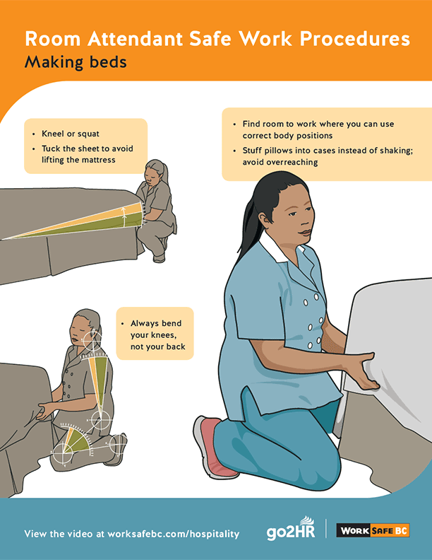 These posters support the video series and discussion guide that are aimed at preventing injuries to room attendants and include making beds, cleaning bathrooms, cloth wringing, high level dusting, emptying the trash and vacuuming.