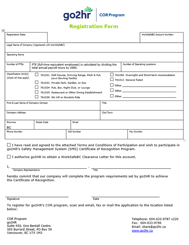 COR Employer Registration Form This form is for employers who want to register for go2HR’s Certificate of Recognition (COR) program. The form is a Word document that you can either print and fill out by hand or fill out electronically. You can fax, mail, or scan and email the form to go2HR. go2HR is BC’s… Continue reading COR Employer Registration Form