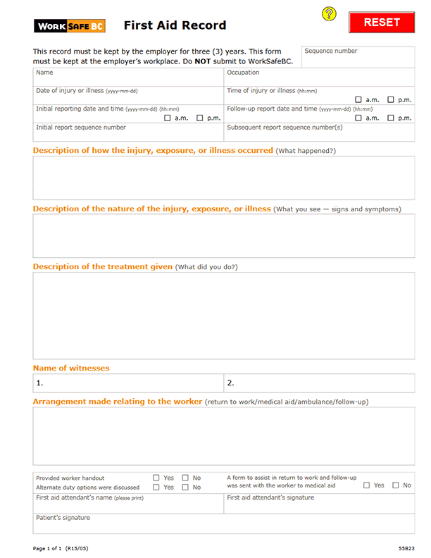 This official WorkSafeBC form is for documenting an injury that required first aid.