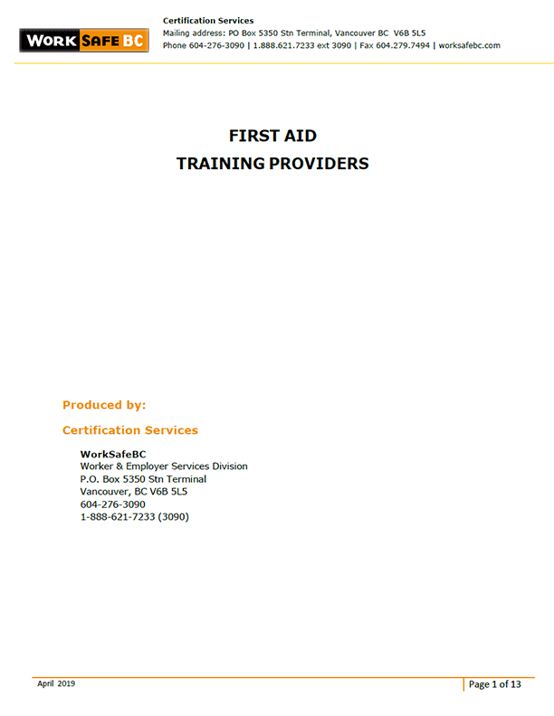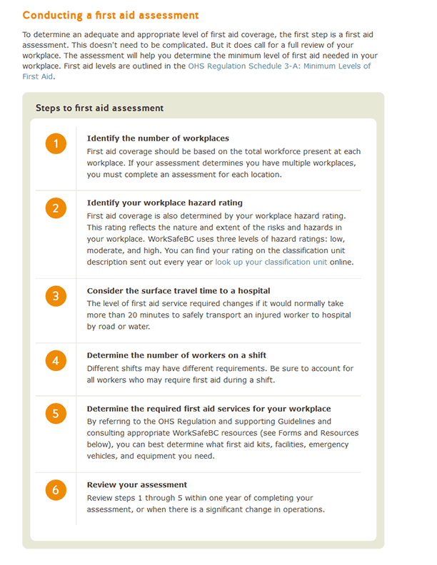 As an employer, you must provide the necessary equipment, supplies, facilities, first aid attendant(s) and services in order to treat injured workers and ensure they are transported to a medical centre. Part 3 of the Occupational Health and Safety Regulation sets out the first aid requirements for B.C. workplaces.