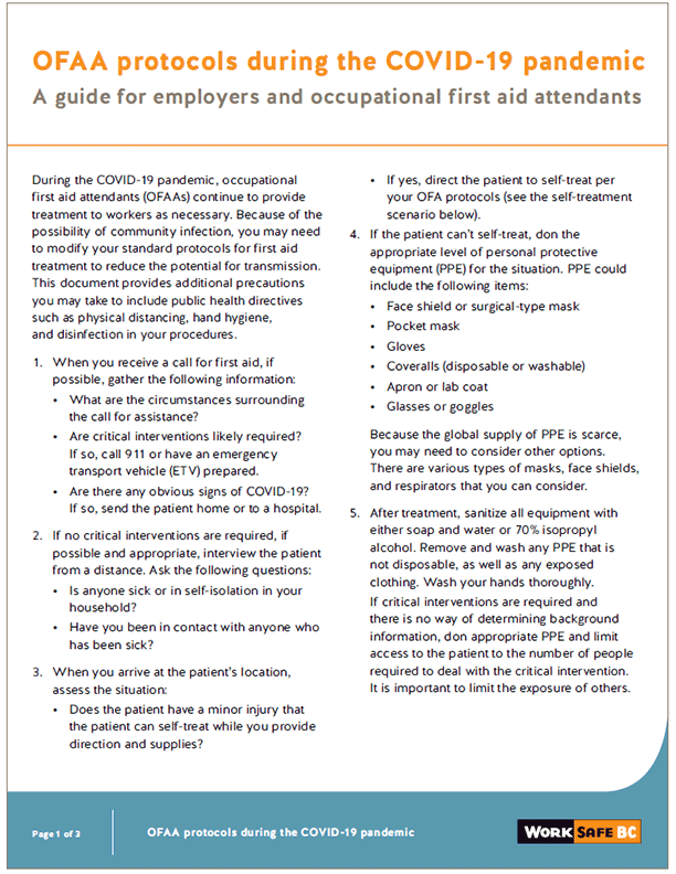 This information sheet provides information to employers and occupational first aid attendants on safely treating patients during the COVID-19 pandemic.