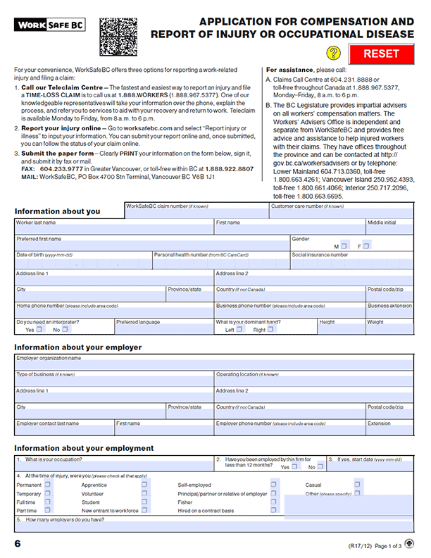 This official WorkSafeBC form is for the worker to report an injury or occupational disease and start a claim.