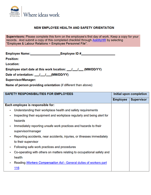 Use this checklist to document training and orientation on an employee’s first day of work.