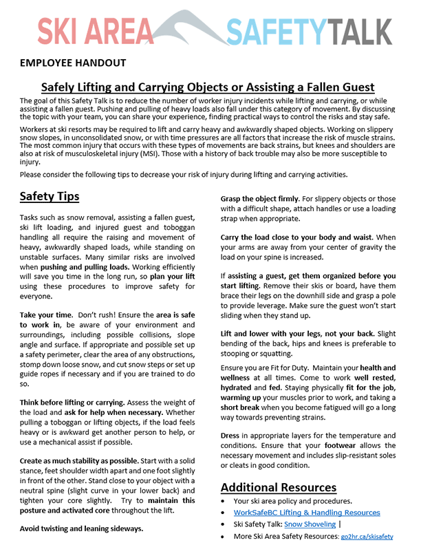 The goal of this Safety Talk is to reduce the number of worker injuries caused by lifting and carrying, or while assisting a fallen guest. Use it as the basis for team meetings, to share ideas and experiences and to find practical ways to help reduce the risks.